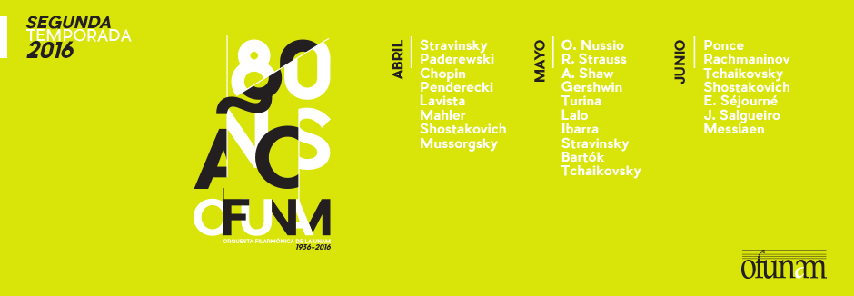 El segundo programa de la OFUNAM se llevará a cabo el sábado 9 de abril a las 20:00 horas y el domingo 10 de abril a las 12:00 horas, en la Sala Nezahualcóyotl del Centro Cultural Universitario (Insurgentes Sur 3000, C.U.), los boletos ($240, $160 y $100) están a la venta en las taquillas de la Sala con el 50% de descuento personal a maestros y estudiantes en general; ex alumnos y trabajadores de la UNAM; y jubilados del ISSSTE, IMSS e INAPAM con credencial vigente. Informes: 5622 7113 y http://www.musica.unam.mx