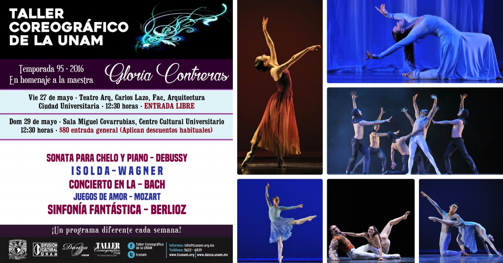 La Coordinación de Difusión Cultural, a través de la dirección de Danza, continúa con las actividades correspondientes a la temporada 95 del Taller Coreográfico de la Universidad Nacional Autónoma de México (TCUNAM), en esta ocasión con un programa en el que la compañía llevará a escena la intensidad dramática del amor y la desilusión a partir de notables piezas de Gloria Contreras, como: «Juegos de amor», «Isolda» y «Sinfonía fantástica» a partituras de Wolfgang Amadeus Mozart, Richard Wagner y Hector Berlioz. Complementarán las funciones «Sonata para chelo y piano» y «Concierto en la» a música de Claude Debussy y Johann Sebastian Bach.