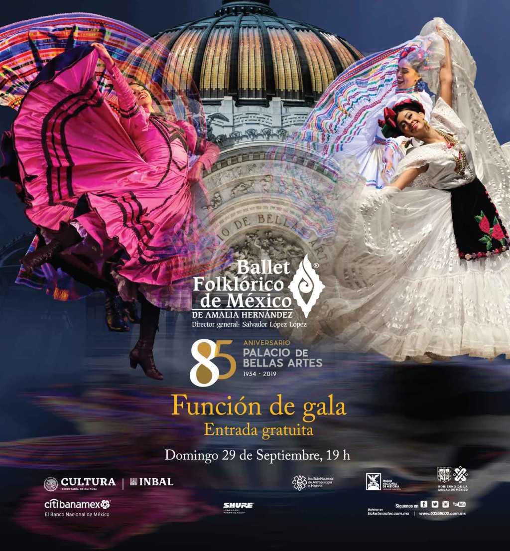 Con dos funciones de gala gratuitas para el público, el Ballet Folklórico de México de Amalia Hernández celebró este domingo el 85 aniversario del Palacio de Bellas Artes en programas que realizaron un amplio y colorido recorrido musical.