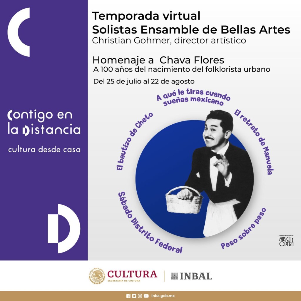 En enero de este año se cumplieron 100 años del nacimiento del también conocido como el ”Compositor de barrio”, y con ese motivo se organizaron diversas actividades culturales como exposiciones y conciertos, mismas que se han visto mermadas debido a la contingencia sanitaria. A pesar de esto, Solistas Ensamble celebrará su vida y obra a través de cinco presentaciones en línea que están programadas de la siguiente manera: sábado 25 de Julio a las 17:00 h., miércoles 5 de Agosto a las 20:00 h. y los siguientes sábados 8, 15 y 22 a las 17:00 h. En éstas podremos disfrutar una selección de los temas más conocidos como: “¿A qué le tiras cuando sueñas?”, “Sábado, Distrito Federal”, “El retrato de Manuela” y “El gato viudo”, entre otros.