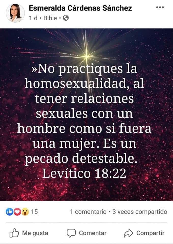 Y es que a la Licenciada Cárdenas le pareció muy lindo despertarnos con un mensaje que decía a la letra: «No practiques la homosexualidad, al tener relaciones sexuales con un hombre como si fuera una mujer. Es un pecado detestable«, una referencia al texto bíblico de Levítico 18:22. No es novedad, pues alimenta constantemente su perfil con contenidos similares.