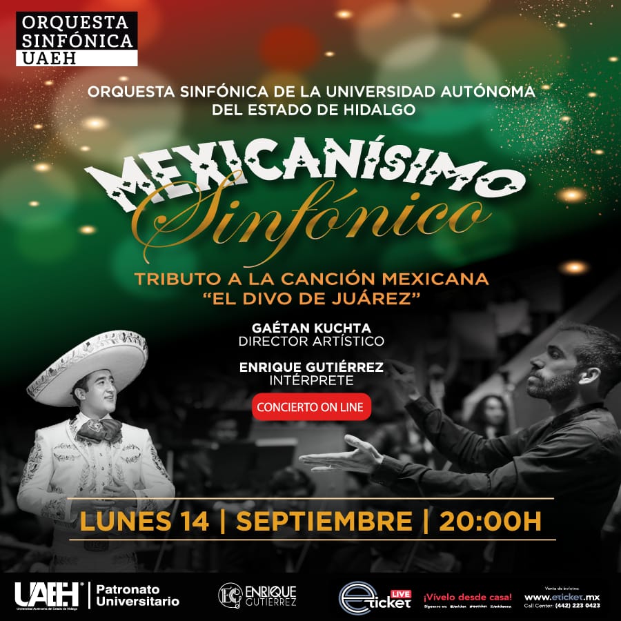 Junto a la voz del hidalguense Enrique Gutiérrez, la orquesta garza interpretará más de una decena de temas del hoy finado compositor que es recordado por sus icónicas actuaciones en recintos como el Palacio de Bellas Artes —donde fuera el primer artista popular—. El concierto podrá disfrutarse a través de la plataforma eTicket mediante donativos que apoyarán las actividades de la OSUAEH como lo señaló su director, Gaétan Kuchta, en entrevista con Mexicana de Arte.