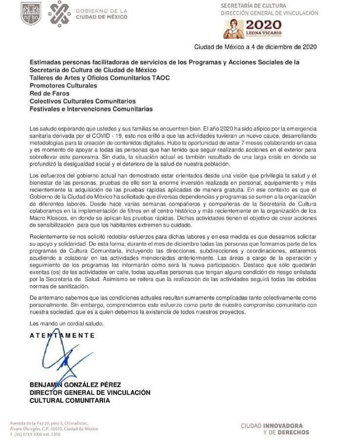 El documento, fechado el 4 de diciembre, está dirigido a «personas facilitadoras de servicios de los Programas y Acciones Sociales de la Secretaría de Cultura de la Ciudad de México, Talleres de Artes y Oficios Comunitarios TAOC, Promotores Culturales, Red de Faros, Colectivos Culturales Comunitarios y Festivales e Intervenciones Comunitarias», es decir, personal beneficiario de programas sociales que no cuenta con seguridad social ni prestaciones pues no son empleados del gobierno local.