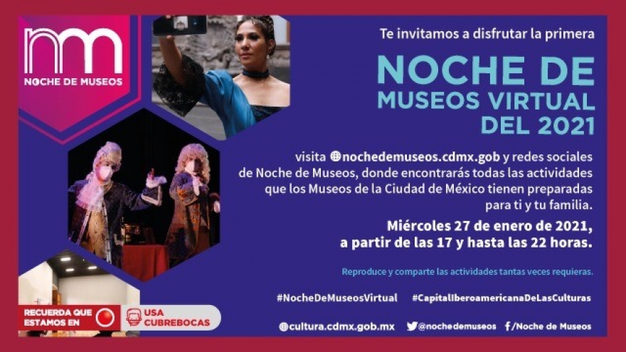 La Noche de Museos Virtual tendrá lugar este miércoles 27 de enero, a partir de las 17:00 y hasta las 22:00 horas. Esta primera sesión del año contará con la participación de más de 35 museos y recintos del Gobierno de la Ciudad de México, del Gobierno federal y de la iniciativa privada que se han sumado a esta celebración mensual.