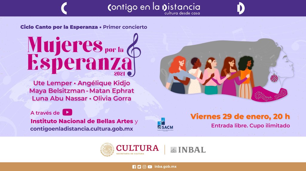 Olivia Gorra, Ute Lemper, Angélique Kidjo, Luna Abu Nassar y Maya Belsitzman unirán sus voces en el concierto Mujeres por la Esperanza, este 29 de enero a través de la plataforma Contigo en la Distancia y el canal de YouTube del Instituto Nacional de Bellas Artes (INBAL) a las 20h (tiempo del Centro de México)