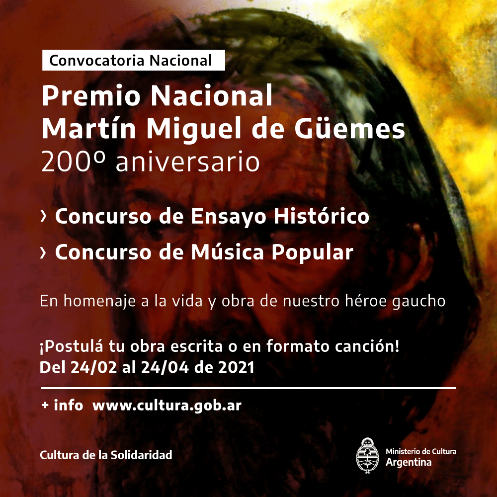 El Ministerio de Cultura de Argentina lanzó el Premio Nacional Martín de Güemes con el objetivo de estimular la investigación histórica y la creación artística, a partir del reconocimiento a la vida, obra e ideario del caudillo argentino, en el 200° aniversario de su muerte, y hay tiempo para participar hasta el 24 de abril.