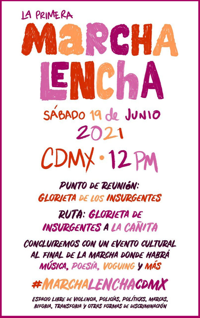 La Marcha Lencha es un ejercicio de ocupación del espacio público convocado por el colectivo homónimo, que se define en su biografía de Twitter como un «espacio de lenchitudes transincluyente» que celebra las «relaciones sexoafectivas de todo tipo entre morras cis, trans, les, bi, pan, no binarixs, queer, etc». La concentración tendrá lugar en la Glorieta de los Insurgentes, en la Colonia Juárez de la CDMX, en punto de las 12h del 19 de junio de 2021.