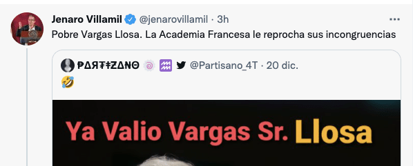 La Academia Francesa no ha manifestado ningún reproche contra el escritor y Premio Nobel Mario Vargas Llosa tal como afirmó Jenaro Villamil, presidente del Sistema Público de Radiodifusión del Estado Mexicano, en su cuenta de Twitter.