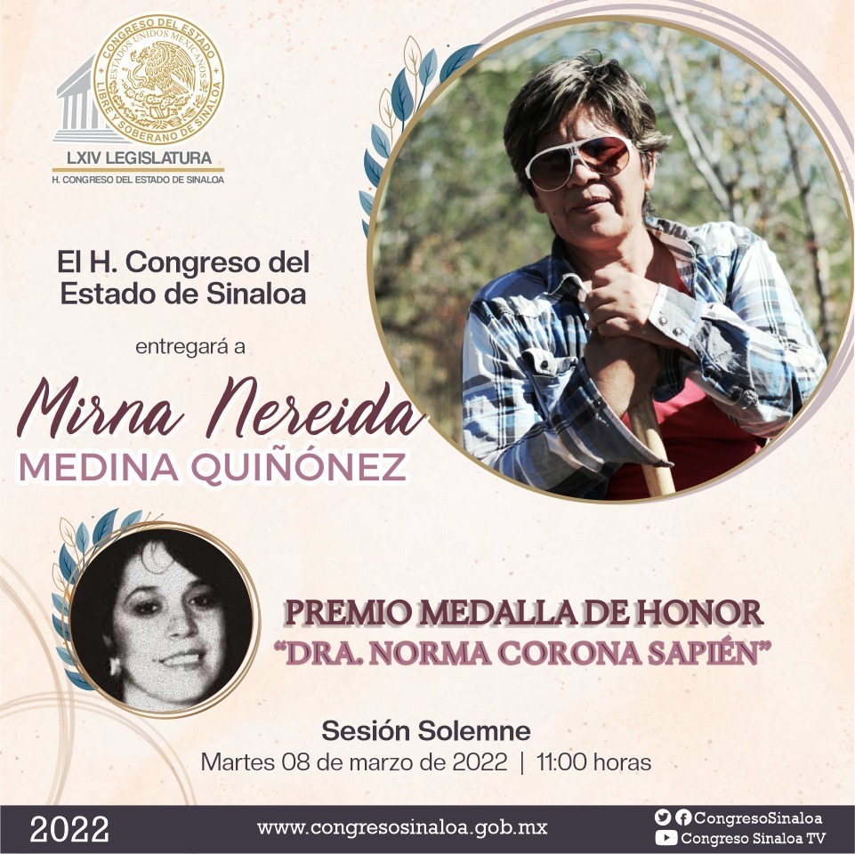 Mirna Medina será reconocida este 8 de marzo por el Congreso del Estado de Sinaloa con el Premio Dra. Norma Corona Sapién, la medalla de honor instituida por el organismo legislativo en 2019 y que reconoce a las mujeres que se distingan o se hayan distinguido por contribuir con sus acciones, virtudes, amplia trayectoria y participación en la defensa por los Derechos Humanos, y que a juicio del Jurado merezcan ser un ejemplo a seguir por las mujeres sinaloenses.