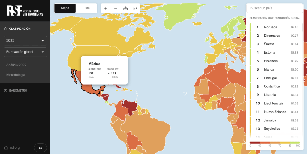 En el marco del Día Mundial de la Libertad de Prensa, Reporteros Sin Fronteras dio a conocer su Clasificación Mundial de la Libertad de Prensa 2022 en la que México mejora su posición respecto de 2021, para pasar del sitio 143 al 127.