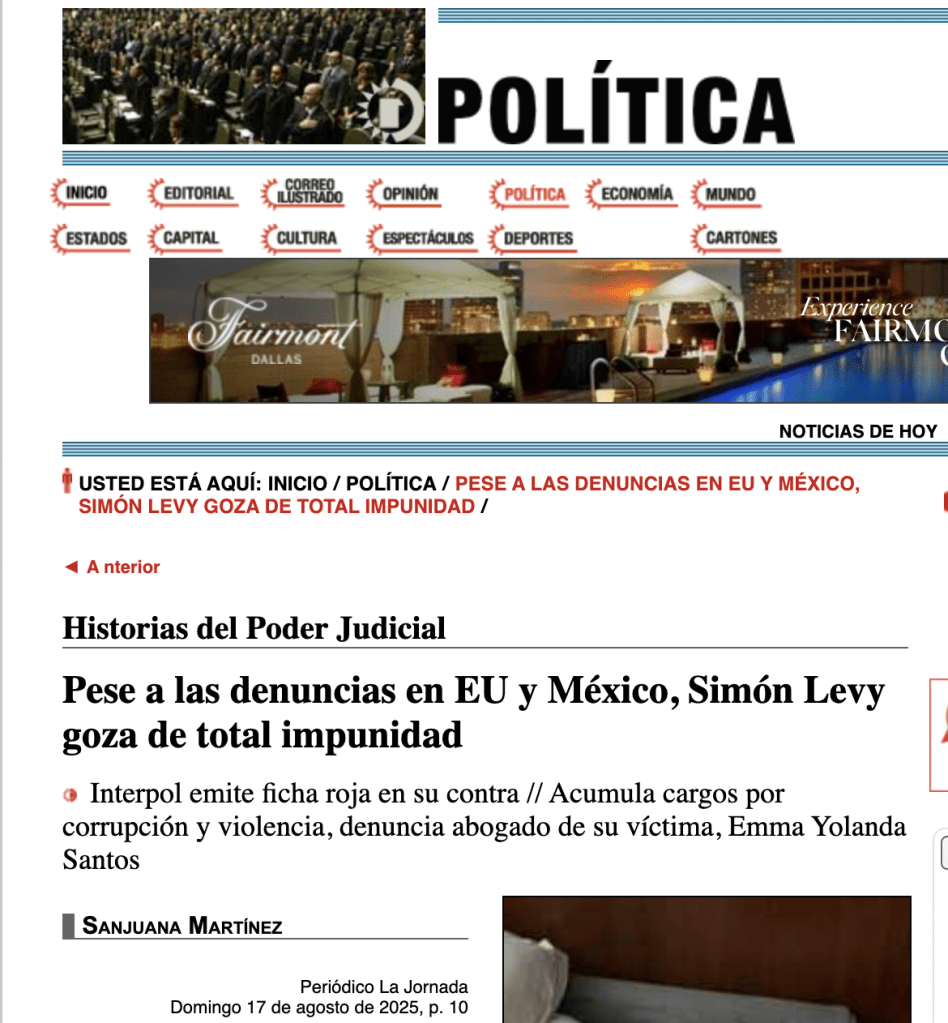 Sanjuana Martínez publicó en el periódico La Jornada que la Interpol ha emitido una ficha roja sobre el abogado Simón Levy Dabbah. La misma afirmación fue realizada por el periodista Juan Becerra Acosta, Los Reporteros Mx y el comentarista Callo de Hacha.
