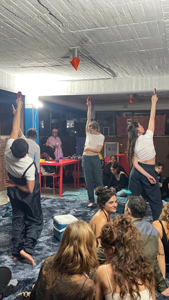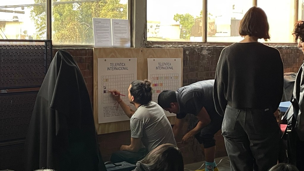 Pía Watson me recibe en mi primera noche aquí. Es actriz y artista performática, su rostro transmite tranquilidad mientras hablamos a pesar de que su cabeza acaba de ejercer un performance complejo donde pone en duda si las ideas vienen de una nube colectiva de pensamiento o son únicas. Para someter su tesis a prueba, invita al público a sentarse y poner en una plantilla los colores que reciben de la música de ukele que suena. Lo llama Telepática Internacional.