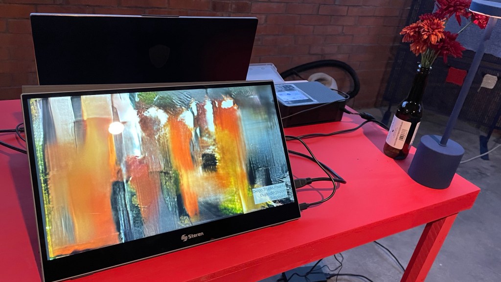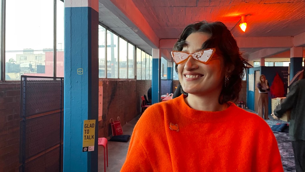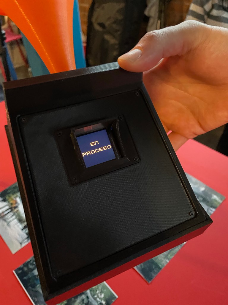Apenas termino de hablar con ella y sigo derecho hasta Diego Trujillo Pisanty, a quien veo fotografiando sonidos con su Blind / Machine: una cámara que inventó él. Grabó 200 horas de video en las calles de Ciudad de México, entrenó a una inteligencia artificial y ahora su cámara crea imágenes sonoras que se observan en una pantalla, generadas a partir de lo que recibe el micrófono del dispositivo y los videos que le precargó